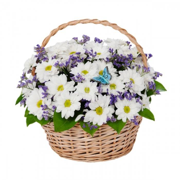 Не просто так в народном фольклоре можно найти сравнение юных красавиц с хрупкими ромашками. Этот цветок неизменно символизирует доброту, открытость и скромность. Если гадать на любовь, то только с помощью ромашек! Плетеная корзина, наполненная пышным букетом романтичных ромашек, станет идеальным презентом для молодой девушки. Цветы будут долго радовать обладательницу своим свежим видом, и заряжать её положительными эмоциями. Мелкие вкрапления яркой фиолетовой статицы выгодно дополнят бело-желтую композицию, как и базовые листочки освежающей весенней зелени.